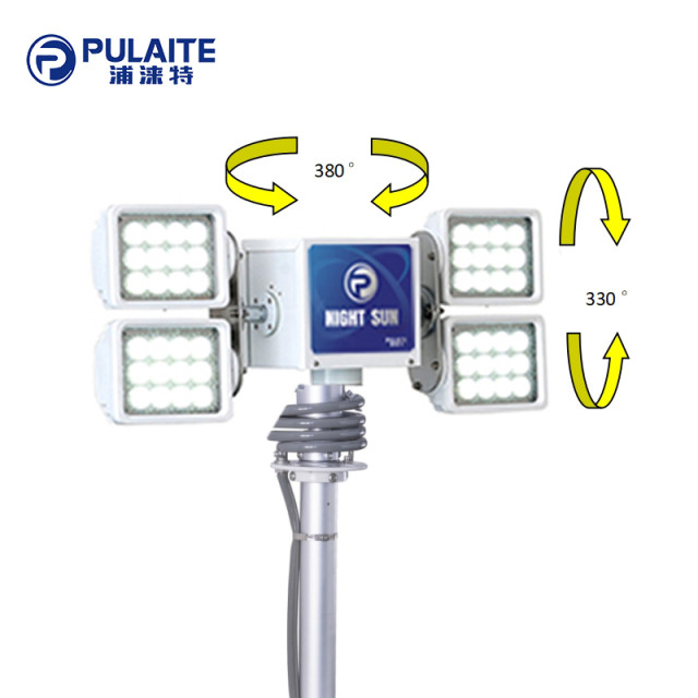It has function of up and down, rising from horizontal to vertical 90 degree, the rotating head can be 380° vertical rotating and 330° horizontal rotating to complete positioning lighting.