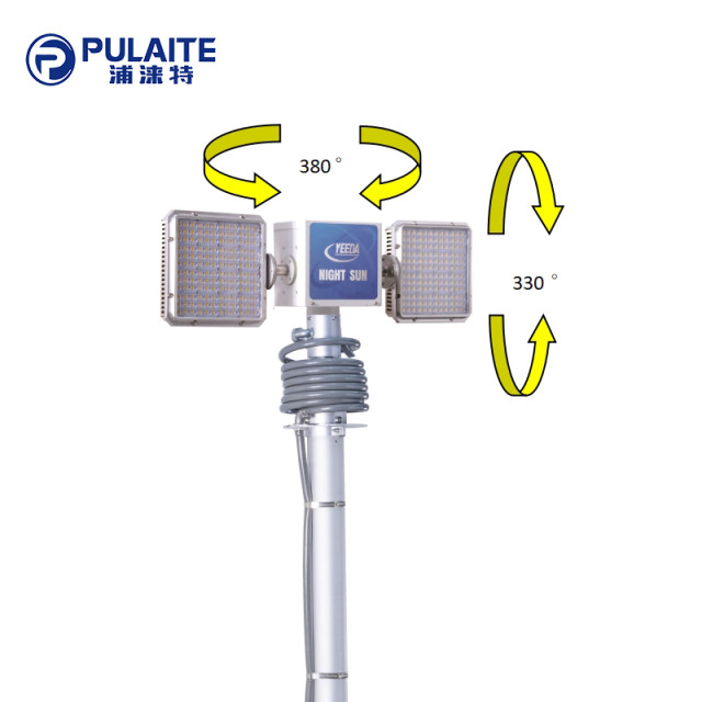 It has function of up and down, rising from horizontal to vertical 90 degree, the rotating head can be 380° vertical rotating and 330° horizontal rotating to complete positioning lighting.